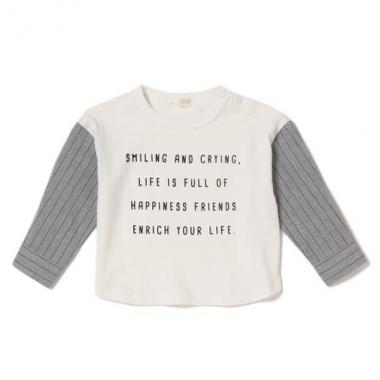 ストライプシャツをドッキングしたような、袖の布帛切り替えがユニークなTシャツです。身頃にはソフトな編地を採用して、カジュアルライクに仕上げたアイテム♪ あたたかみのあるメッセージロゴも印象的。内側にお名前を記入できるタグつきです。※80、90サイズのみ肩開き