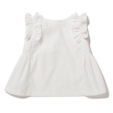 肩へ共布のフリルをあしらい、華を添えたノースリーブラウスです。サイドタックからふわりと広がるAラインシルエットがガーリーな雰囲気♪ 内側にお名前を記入できるタグつきです。バックネックはボタン開き仕様。