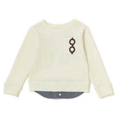 胸ポケットにメガネモチーフ、背中にロゴアップリケをドンと飾った、個性あふれるニットTシャツです。シャツをインに合わせているような、レイヤード風の裾切り替えがおしゃれ♪ 内側にお名前を記入できるタグつきです。※80、90サイズのみ肩開き・モデルサイズ111cm・着用サイズ110cm