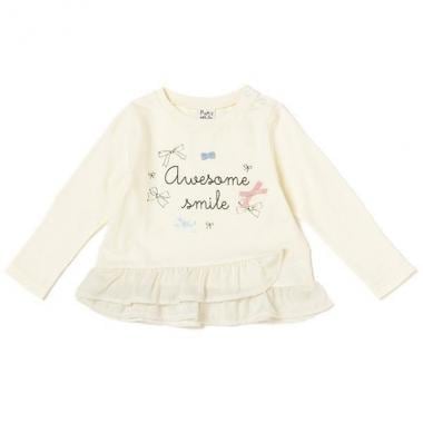 ツヤ感のあるフリルが裾コンシャスなミニ裏毛Tシャツです。フロントには大きさや素材の異なるリボンをつけてニュアンスをプラス♪ 裾のボリュームを生かす、スキニータイプのボトムスと合わせるのがおすすめです。※80、90サイズのみ肩開き