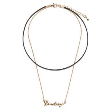 コード×チェーンの異素材コンビで、スタイルに個性をプラスする2連ネックレスです。ストーンつきのきらめくロゴモチーフがブランドをリッチに印象づけるアイテム♪ アジャスターがついており、お好みでサイズ感を調節できます。