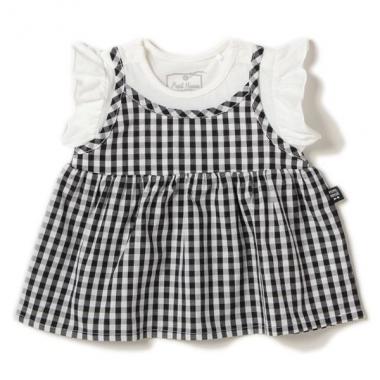 キャミを重ね着しているようなデザインのTシャツです。フリルの袖がスイートなアクセントに♪ ギャザーを寄せたボリューム感のあるシルエットで、女の子らしく着こなせるアイテムです。カラーによってキャミのパターンが異なります。※80、90サイズのみ肩開き