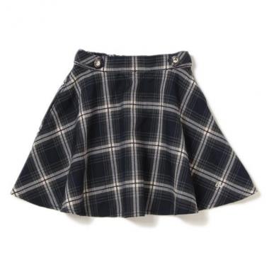 シックなカラーリングで大人っぽく決まるチェック柄スカートです。ふわりと波打つキレイなフレアシルエットがスタイルを女の子らしく演出♪ ウエストでキラリと輝くメタルボタンも目を引くアクセントに。右サイドにポケットつき。ウエストはアジャスターゴムでサイズ調整が可能です。