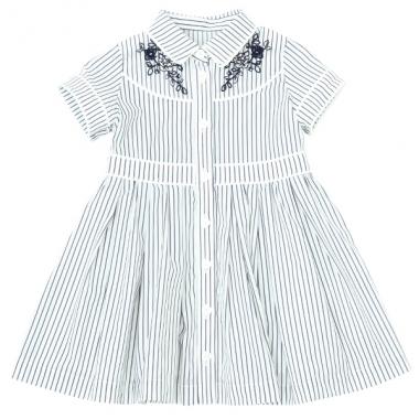 ローズモチーフの刺しゅうをほどこした上品なシャツドレス。全体にストライプ柄をあしらったさわやかなルックスの一着です。ウエストから裾にかけて広がりのある、ガーリーなフォルムもポイント。さらりとしたコットンブレンドの素材を使用し、着心地も軽やかです。両サイドにポケットつき。裏地つき。