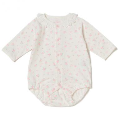 レース衿でネックまわりをキュートに演出するボディです。全体にちりばめた小花柄でガーリームードたっぷり♪ おむつ替えやお着替えがしやすいスナップボタン仕様です。股部分にはギャザーゴムを入れてフィット感を持たせました。