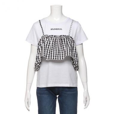 一枚でレイヤードスタイルが完成するTシャツです。ビスチェをドッキングしたようなおしゃれなデザイン♪ なめらかで伸縮性があり、体にしっかりフィットします。オフホワイトはチェック、グリーン・黒はドットとカラーによって柄のパターンが異なります。黒のみビスチェ部分はシフォン生地です。※ボトムスは参考商品です・モデルサイズ159cm・着用サイズ150cm