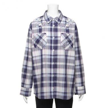 コーディネートがパッと華やぐ、お花刺しゅう入りのシャツです。袖の内側にタブを配しており、ロールアップアレンジもおしゃれに決まるアイテム♪ 紺はチェック柄、サックスは無地と、カラーによって異なるパターンを採用しました。※ボトムスは参考商品です