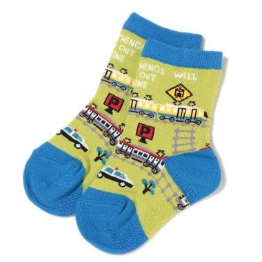 はくだけで注目を集めるインパクト抜群なクルーソックスです。車や線路に電車を走らせたデザインがなんともおしゃれ♪ 鮮やかな色合いが元気なお子さまにもぴったり。かかとやつま先などはカラーで切り替えニュアンスに変化をプラスします。
