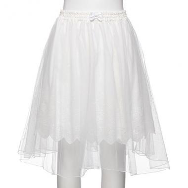 カットワーク刺しゅう入りのレース生地に、軽やかなチュール素材をふわりと重ねたスカートです。女の子らしいロマンティックなデザインで、コーデに甘いムードをもたらすアイテム♪ 上部へリボンモチーフをあしらい、細部まで愛らしい仕上がりに。ウエストゴム入りです。