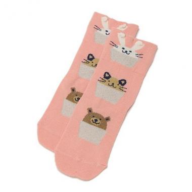 カップケーキに動物をドッキングしたデザインがキュートなクルーソックスです。にっこりした表情のウサギや猫がなんとも愛らしいポイント♪ バックスタイルにはしっかりとブランドをアピールするロゴ入りです。SS、Sサイズのみすべり止めプリントがついています。