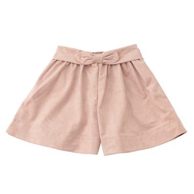 大人っぽいスエードタッチの生地で仕立てたキュロットパンツ。ウエスト中央にあしらったボウがキュートなワンポイントです。ウエスト後ろにゴム入りで、程よくフィットし着脱もスムーズなのがうれしいところ。無地なので、柄アイテムとも相性よく決まります。両サイドにポケットつき。