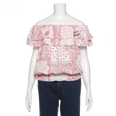 女の子らしいスタイリングが叶うオフショルダーです。フリルを重ねることでよりガーリーな雰囲気に♪ ウエスト位置にギャザーを入れることで、スタイルよく見せてくれます。紺・赤はバンダナ柄、ピンク・エメラルドグリーンはマルチボーダー柄と、カラーによってパターンが異なります。※ボトムスは参考商品です