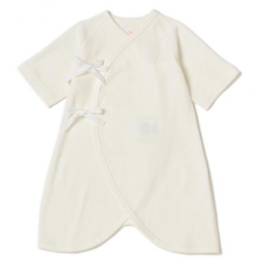 部屋着としてもお出かけ着のインナーとしても着用できるコンビ肌着です。控えめなドット状の模様の中に、胸のハートアップリケをつけてキュートなポイントに♪ 赤ちゃんが足をバタバタと動かしてもはだけないよう、股下はスナップボタンがついています。