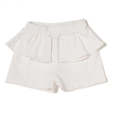 しっかりとした素材でシンプルに仕上げたショートパンツです。ヒラヒラのフリルをつけて甘さをプラス♪ リブ仕様のウエストで、フィット感のあるはき心地なのもポイントです。柄物でも無地でも、どんなトップスにもなじむのでワードローブに加えておきたい便利な一枚です。