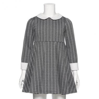 衿とカフスをホワイトカラーで切り替えた、上品かつさわやかなムードがただようワンピースです。フィット&フレアのメリハリあるシルエットが女の子らしい印象を与えるアイテム♪ お呼ばれや入卒園といったシーンにも活躍します。紺は無地、チャコールはストライプ柄です。ペチコートつき。※内側にお名前タグつき・モデルサイズ104.5cm・着用サイズ110cm