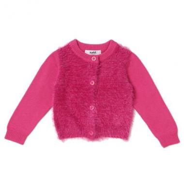 前身頃へラメ入りのシャギーヤーンを採用して、リッチな表情に仕上げたニットカーディガンです。背中に大きくブランドネームを掲げた、インパクトのある後ろ姿もポイント♪ 内側にお名前を記入できるタグつきです。