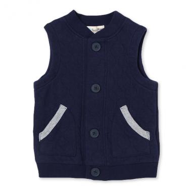 温かさに包まれたような雰囲気にほっと心が和むベストです。キルト特有の縫い目でシンプルなデザインに表情をつけました。ポケット口の別布もいいアクセント。肩の動きを妨げないベストは一枚あるとデイリーにとても重宝します。