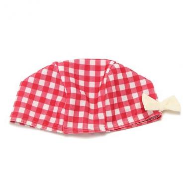 キュートなデザインにリボンのワンポイントを添えたスイムキャップです。布地を切り替えて立体感のある仕上がりに♪ 頭にしっかりとフィットするので遊びに夢中になっても安心です。赤と紺はチェック柄、モデレートピンクとモデレートブルーは花柄とカラーによってパターンが異なります。