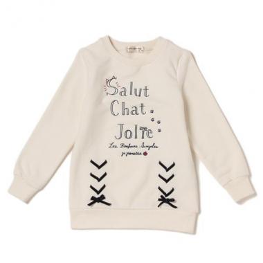 ネコ耳や足跡をミックスしたロゴ刺しゅうがキュートに映える裏起毛トレーナーです。裾へレースアップをほどこして、女の子らしい甘い表情に仕上げたアイテム♪ パンツにもスカートにも良くマッチする1着です。※ジュニアサイズあり、品番:4974216