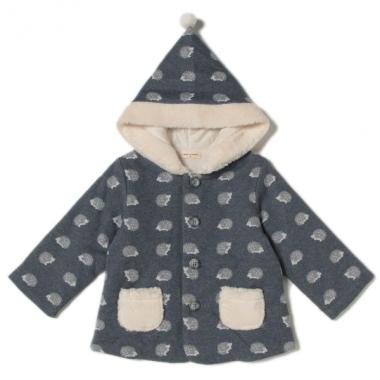 スタイルを愛らしく演出する動物柄のコートです。フード口やポケットにボア素材を採用して、あたたかみのあるルックスに仕上げたアイテム♪ お子様に安心なオーガニックコットンの生地を使用しています。紺はハリネズミ柄、ブルーは白クマ柄です。