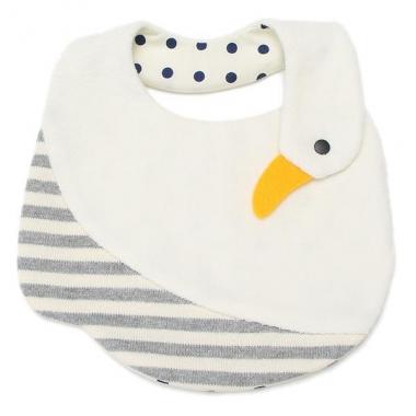 あひるのボディとボーダーを切り替えた、デザイン性あふれるスタイです。やさしいパイル素材で赤ちゃんもごきげん♪ あひるの顔部分にはスナップボタンがあり、二段階まで首まわりのサイズ調節可能な仕様です。スタイリングの一部としても引けを取らないおしゃれアイテムになっています。
