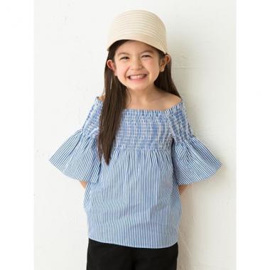コーデにさわやかなムードをもたらす、ストライプ柄のオフショルダーブラウスです。コンパクトなシャーリング部分と、ふんわり感のあるシルエットのコントラストが絶妙♪ 甘いイメージになり過ぎず、スタイリングに取り入れやすいアイテムです。・モデルサイズ109cm・着用サイズ110cm