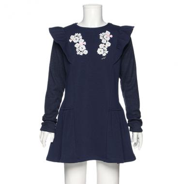 ショルダーにフリル、フロントにレースやリボンをあしらい女の子らしさを引き出したワンピースです。腕部分はニットで切り替えるユニークなデザインがちょっぴり個性的♪ 肌への接地面には温かさをキープしてくれる裏起毛を採用しています。両側にポケットつきです。