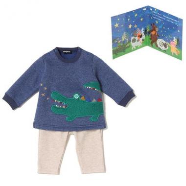 モコモコとしたアニマル柄が目を引くセットアップです。トップスには裏毛素材を採用しました。単品でもスタイリングが可能な、デイリーユースに活躍してくれるアイテムです! ブルーはワニ柄、トップグレーは羊柄と、カラーによって異なるパターンを採用しました。この商品1点につきポリオワクチン1人分がJCVに寄付されます。ミニ絵本つき。