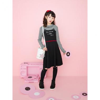 愛らしいネコモチーフの切り替えやロゴ刺しゅうが目を引くワンピースです。無地とボーダー柄を組み合わせた、レイヤード風のデザインがポイント♪ ウエストへ色鮮やかなリボンをあしらい、ガーリームード満点に仕上げました。身頃サイドはファスナー開き仕様です。※右側ポケットつき