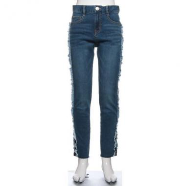 スッと縦に配したサイドのフリルが個性を放つデニムスキニーパンツです。ヴィンテージ風の自然な色落ちにこだわりが光るアイテム♪ ウエスト内側へホック式の留め具を配しており、開け閉めがしやすいのもポイントです。※アジャスターゴムでウエスト調節可能
