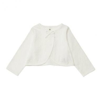結婚式や発表会などのフォーマルなシーンでも活躍してくれるガーリーなボレロ。ドレスやブラウスをさらにエレガントにしてくれるポイントアイテムとしてはもちろん、肌寒いときの羽織りものとしても大活躍します。上品なダイヤ柄の透かしが、スタイリングを女の子らしくブラッシュアップ。前合わせ部分にちょこんと添えたリボンもキュートです。清楚な雰囲気のフレンチクリームカラー。コットン100%のやさしい肌触りも魅力です。