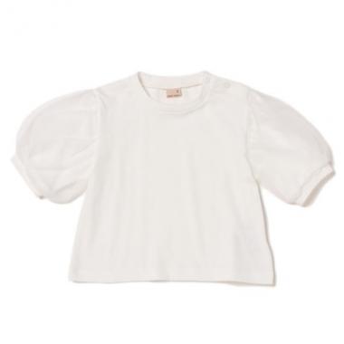丸みを持ったバルーンスリーブに軽やかなチュールをかぶせたとてもガーリーなTシャツです。ゆとりのあるボックスシルエットにふんわりスリーブがなじみます。ミニマルなデザインなので、ボトムスに柄物を持ってきたりとちょっとした冒険が出来るのも魅力です。※80、90サイズのみ肩開き