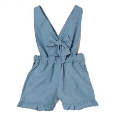 フロントのリボン飾りや、裾のフリル切り替えに女の子らしいムードがただようオールインワンです。上身頃は胸当て風にデザインされており、インナーを効果的にアピールできるのが◎。ライトブルーは無地、黒はギンガムチェック柄と、カラーによってパターンが異なります。