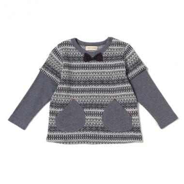 幾何学柄と無地のコントラストで魅せる切り替えTシャツです。首元へ蝶ネクタイ風のリボンを配した、コーディネート風のおしゃれなアイテム♪ 前身頃にポケットをデザインしており、ちょっとした小物をしまえるのもポイントです。