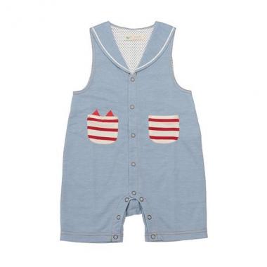 セーラー服を思わせるような襟が特徴的なサロペットです。愛らしいねこをモチーフとしたボーダー柄のポケットがアクセント♪ スナップボタンで簡単に開閉できるので、おむつ替えやお着替えがしやすいのも嬉しいポイントです。