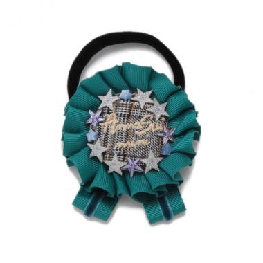 上品かつ愛らしいムードをただよわせるロゼットシュシュです。色々な素材感のスターパーツをトッピングして、華やかなきらめきをプラスしたアイテム♪ ロゴ刺しゅうがほどこされた中央のモチーフは、ブルーグリーンがチェック柄、パープルが無地と、カラーによってパターンが異なります。