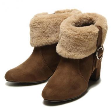 足元をリッチに演出する、フェイクファーつきのショートブーツです。本体にはスエードタッチの素材を採用して、大人っぽい雰囲気に♪ サイドの丸形バックルが動くたびキラリと主張します。安定感のある太ヒールデザインもポイントです。