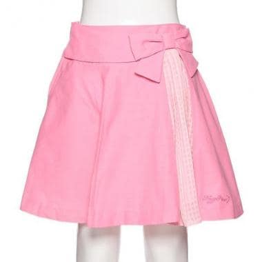 チェックプリーツの切り替え上部へリボンを配した、アシンメトリーなデザインがおしゃれ心をくすぐるスカートです。ふんわりとボリュームのあるシルエットと相まって、愛らしい雰囲気ただよう仕上がりに♪ 裾のキュートなロゴ刺しゅうも見逃せません。右側ポケットつき。※アジャスターゴムでウエスト調節可能