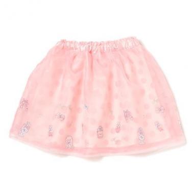女の子の心をくすぐるコスメやリボンなどを刺しゅうで描いたスカートです。透け感のあるシフォン素材には薄くドット柄を入れてさりげないアクセント♪ ツヤのあるウエストは、アジャスターゴムで調節可能です。動くたびにひらひらと揺れる生地のニュアンスはガーリームードたっぷりです。