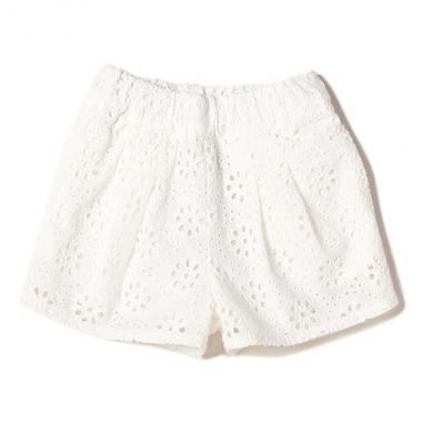コットンレース仕立てのナチュラル&ガーリーなショートパンツです。フラワー風のカットワーク刺しゅうが愛らしい表情をメイク♪ タックで腰周りに適度なゆとりを持たせており、はき心地も良好です。両側ポケットつき。
