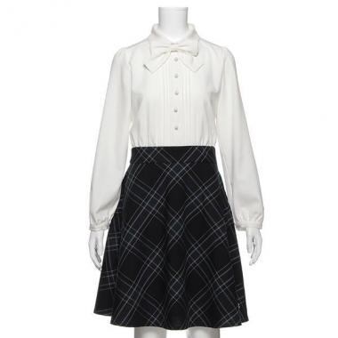 丸衿ブラウスとチェックスカートが一体となった、コーデ風デザインの切り替えワンピースです。女の子らしく品のあるルックスで、卒服などフォーマルなシーンにも活躍するアイテム♪ 首元のリボンはお好みで取り外せる仕様です。右側ポケットつき。サイドファスナータイプ。