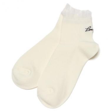 はき口へチュールフリルをあしらい、女の子らしい甘い表情に仕上げたソックスです。後ろ姿をおしゃれに演出する配色のロゴ刺しゅうがポイント♪ 細かいリブ状の編地が足元をスッキリと見せてくれます。パンプスやブーティーを合わせて大人っぽくコーデしても◎。