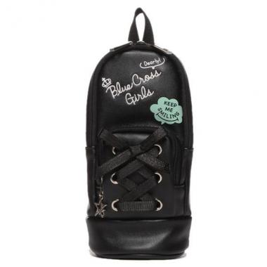 外ポケットにレースアップをほどこした、女の子らしいペンポーチです。ナナメに刺しゅうしたブランドネームや、ロゴとスマイルマークを組み合わせた吹き出しなど、ディテールも個性が光る仕上がり♪ 本体には落ち着いた色合いのフェイクレザーを使用しており、甘いイメージになり過ぎないのが◎。