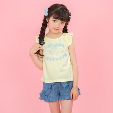 ラメの入ったブランドロゴを囲むような、リアルなリボンプリントが印象的なタンクトップです。立体を感じさせるリボンは、ギンガムチェックやボーダーなどバリエーション豊か。袖口には幅を変化させたフリルをつけてチャーミングなポイントに♪ コーディネートの主役になれる一枚です。・モデルサイズ128cm・着用サイズ120cm