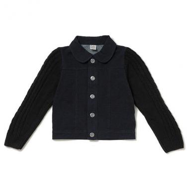 身頃はデニム風裏毛生地、袖はニット素材で切り替えた表情豊かなジャケットです。丸みを帯びた衿や、ケーブル柄をほどこした袖などディテールまでこだわりが光るアイテム。存在感がありつつも、全体を同系色でまとめているのでコーデにも取り入れやすいアイテムです。