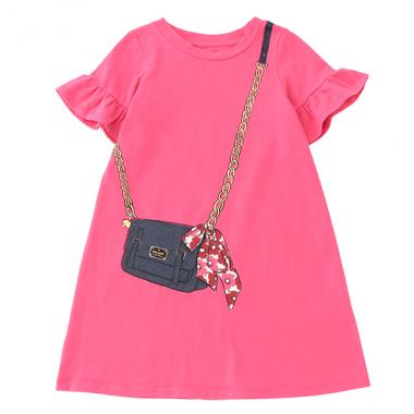 まるでスカーフつきバッグを肩にかけているような、ユニークなトロンプルイユデザインのドレス。グリッターのプリントが華やかな印象です。袖はフリルに仕上げて、キュートなアクセントを効かせました。裾にかけてゆったりと広がるAラインもポイント。やさしい肌触りの生地で、着心地も抜群です。