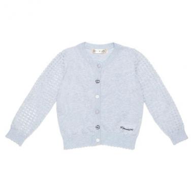 ストライプ、チェック、ドット柄のくるみボタンをあしらった、表情豊かなニットカーディガンです。柄編みで切り替えた袖は全体に抜け感をプラス♪ スカラップ形のポコポコとした袖口や裾のラインもガーリームードを高めます。・モデルサイズ120cm・着用サイズ120cm