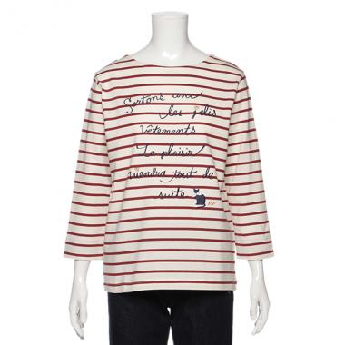 フレンチカジュアルなスタイルを楽しめる、ボーダー柄のボートネックTシャツです。フロントへ手書き風タッチのロゴやネコモチーフを刺しゅうした、個性の光るアイテム♪ 袖口裏に別布を合わせているので、ロールアップアレンジもおしゃれに決まります。※ボトムスは参考商品です