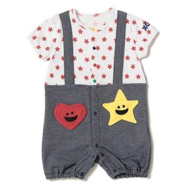 柄Tシャツとサスペンダーつきのパンツを合わせているような、重ね着風デザインのカバーオールです。スマイルフェイスのキラッキー&ハートポケットがほほ笑みを誘うアイテム♪ ロゴを大きく掲げた背中も印象的。紺はスター柄、トップグレーはボーダー柄と、カラーによってパターンが異なります。