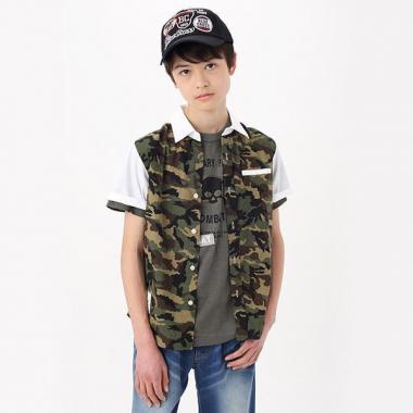 無地と柄生地のコントラストが目を引くシャツです。カーキは迷彩、黒はストライプと、カラーによって異なるパターンがポイント。配色で切り替えた第二ボタンや、雰囲気のある裾のロゴパッチもセンスが光るディテールです。・モデルサイズ163cm・着用サイズ150cm